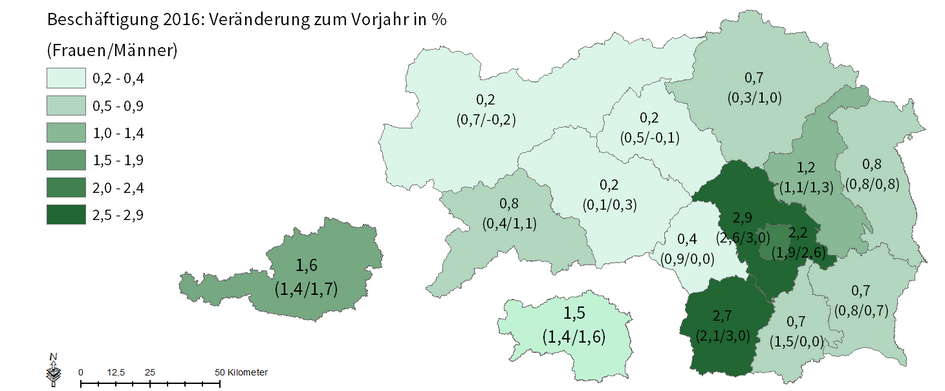 Das Beschäftigungswachstum in der Steiermark wurde im Jahr 2016 primär durch den Großraum Graz (Bezirke Graz, Graz-Umgebung) getrieben. Hier stieg die Zahl der Aktivbeschäftigten im Vergleich zu 2015 im Jahresdurchschnitt um +2,4 % oder +5.211 Beschäftigungsverhältnisse. Damit gingen fast drei Viertel des gesamtsteirischen Beschäftigungswachstums auf den Großraum Graz zurück.