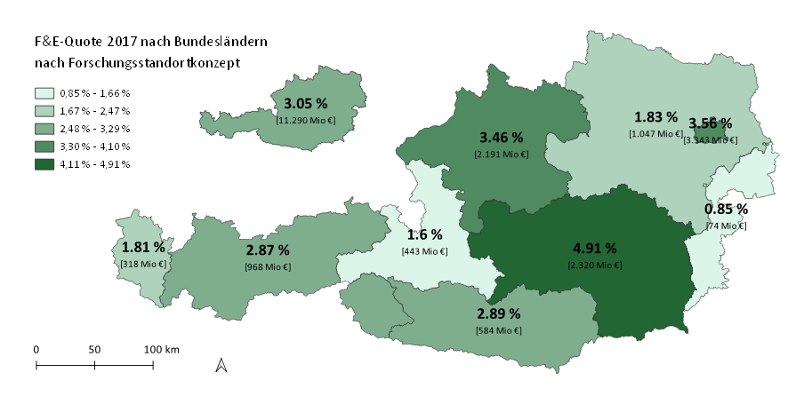 Wie in den vergangenen Jahren weist die Steiermark auch im Jahr 2017 die höchste F&E-Quote aller österreichischen Bundesländer auf. Mit F&E-Ausgaben von 2,32 Milliarden Euro (nach Forschungsstandort) konnte eine F&E-Quote von 4,91 % erzielt werden. Dahinter folgen die Bundesländer Wien (3,56 %) und Oberösterreich (3,46 %), Kärnten (2,89 %) und Tirol (2,87 %). Deutlich unter dem nationalen Durchschnitt liegen die Bundesländer Niederösterreich (1,83 %), Vorarlberg (1,81 %), Salzburg (1,60 %) sowie das Burgenland (0,85 %).