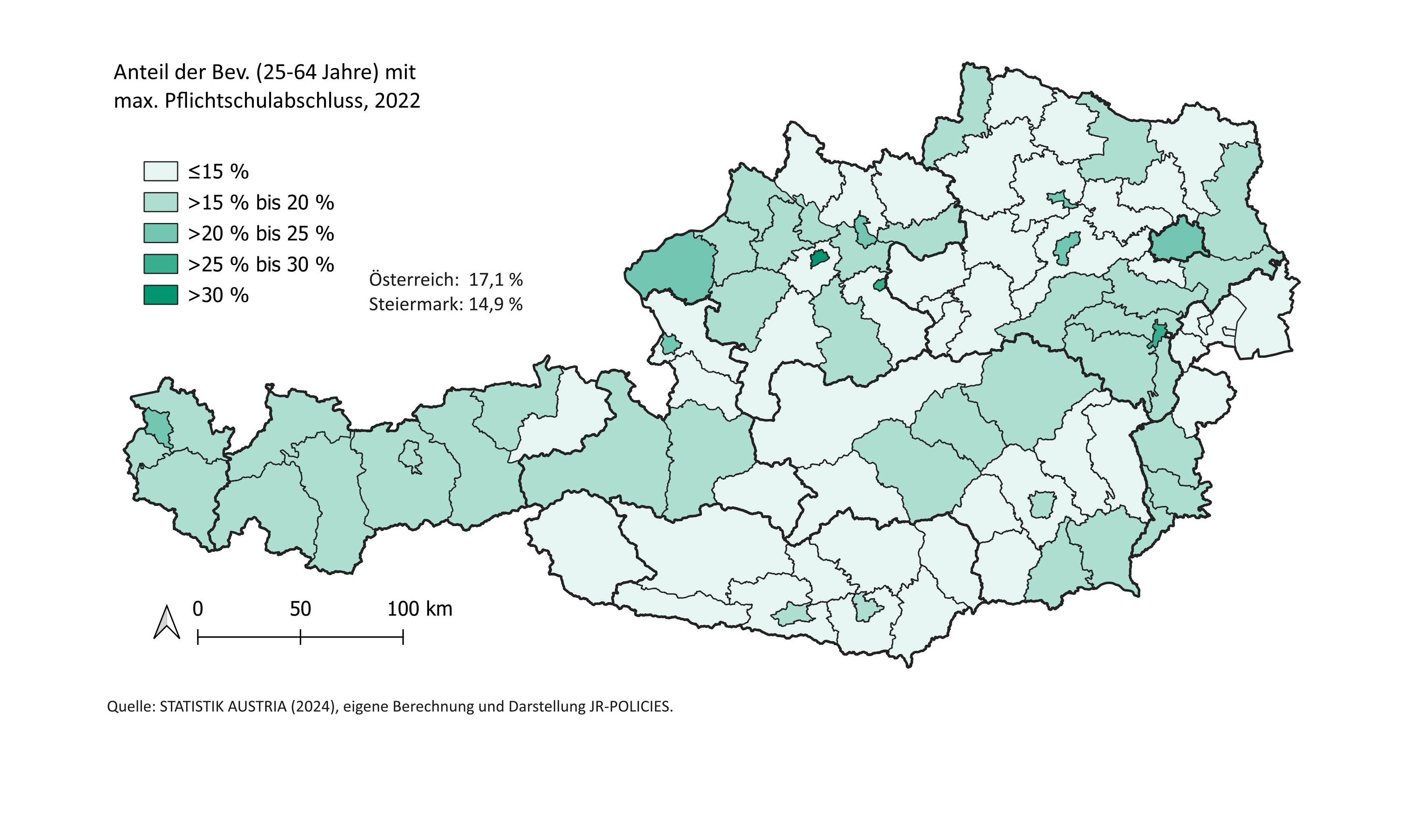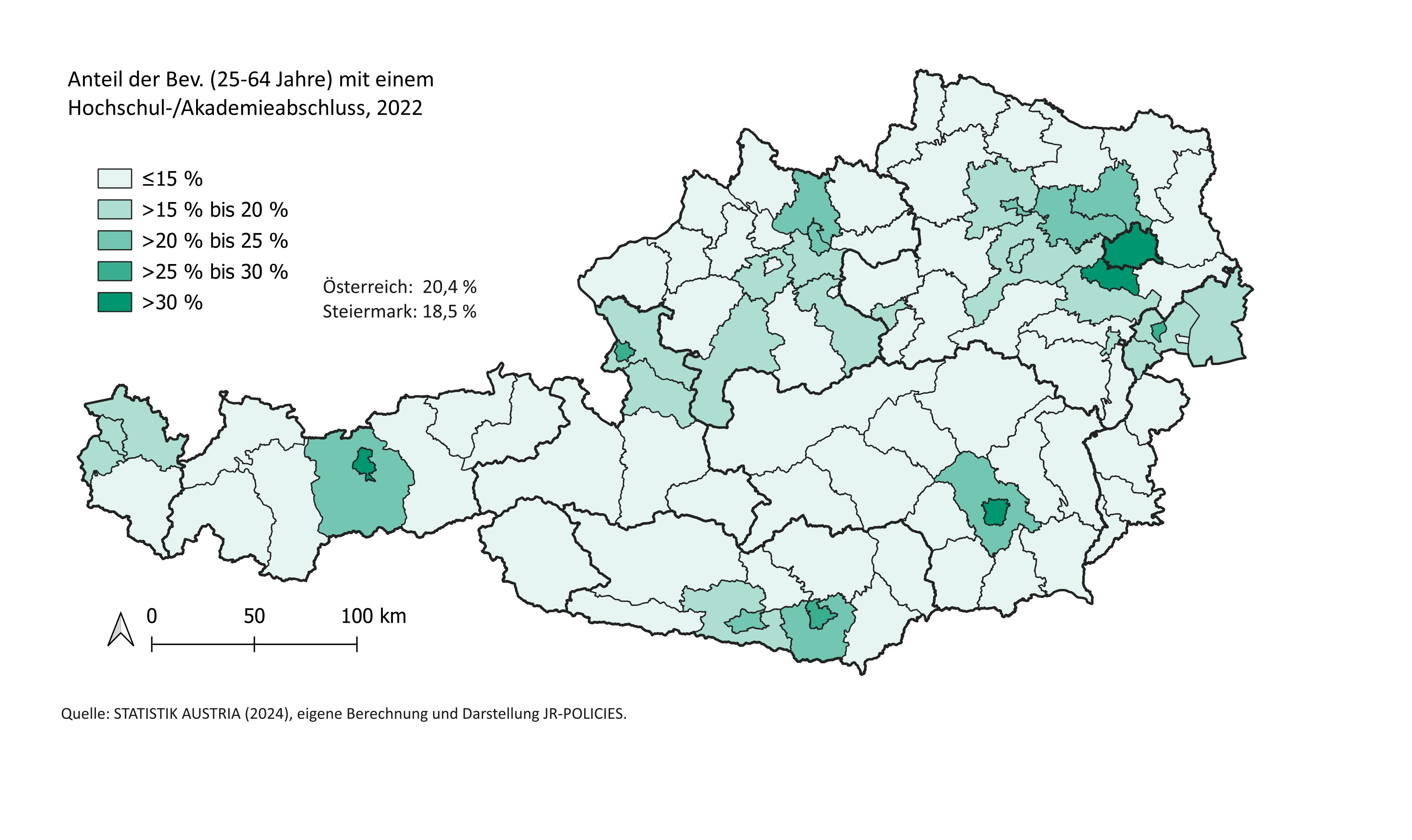 Innerhalb der steirischen Bezirke liegt in den Bezirken Graz (Stadt) (18,0 %), Murtal (16,2 %) sowie Leibnitz (16,1 %) der Anteil der Personen mit max. einem Pflichtschulabschluss am höchsten, im Bezirk Murau ist er am geringsten (10,2 %). Auch im Österreichvergleich zeigt sich die geringe Konzentration der Personen mit höchstens einem Pflichtschulabschluss im Bezirk Murau, lediglich in den Bezirken Hermagor, Urfahr-Umgebung und Villach Land werden im Vergleich der österreichischen Bezirke niedrigere Werte erzielt. In der Stadt Wels hingegen verfügt fast jede dritte Person nur max. über einen Pflichtschulabschluss (30,4 %). Bei der Akademiker:innenquote zeigt sich deutlich ein Stadt-Land-Gefälle, wobei der Bezirk Graz (Stadt) mit einem Anteil von rund 35,7 % der 25-64-jährigen Wohnbevölkerung noch vor Innsbruck-Stadt (35,1 %), Mödling (30,6 %) sowie Wien insgesamt (30,3 %) auf Platz eins in Österreich liegt. Die Steiermark führt den österreichischen Bezirksvergleich mit Graz (Stadt) nicht nur an, mit dem Bezirk Südoststeiermark positioniert sich ein steirischer Bezirk auch an letzter Stelle. Lediglich 9,4 % der südoststeirischen Wohnbevölkerung zwischen 25 und 64 Jahre verfügte im Jahr 2022 über einen Hochschul- bzw. Akademieabschluss.