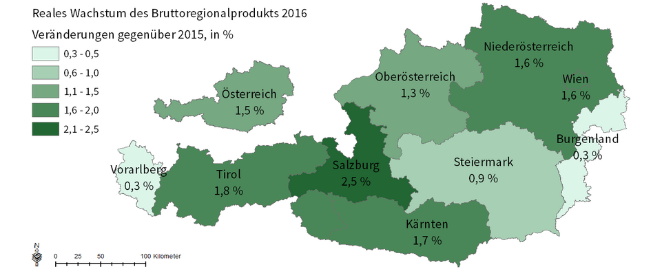 Im Bundesländervergleich wies im Jahr 2016 insbesondere Salzburg eine hohe reale Wachstumsrate von +2,5 % auf. Auch in Tirol (+1,8 %), in Kärnten (+1,7 %), in Niederösterreich (+1,6 %) und in Wien lag die Wachstumsrate leicht über dem nationalen Durchschnitt, in Oberösterreich (+1,3 %) war die Dynamik leicht unterdurchschnittlich. Wie die Steiermark wiesen Vorarlberg und das Burgenland (je +0,3 %) ein unterdurchschnittliches Wachstum auf.
