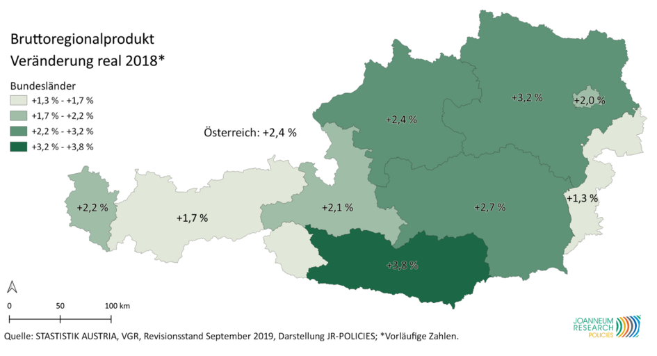Die steirische Wirtschaft verzeichnete im Jahr 2018 ein reales Wachstum von +2,7 % (gemäß den vorläufigen Zahlen der Regionalen Gesamtrechnung (RGR) der Statistik Austria). Der reale Anstieg des steirischen Bruttoregionalproduktes (BRP) lag damit über dem nationalen Durchschnitt (+2,4 %). Im Bundesländervergleich lag die Steiermark nach Kärnten (+3,8 %) und Niederösterreich (+3,2 %) an dritter Stelle. Während alle Bundesländer ein reales Wirtschaftswachstum verzeichneten, bildete Burgenland, mit einem realen Anstieg des BRPs in der Höhe von +1,3 %, das Schlusslicht. Auch gemessen an der Einwohnerzahl (BRP/Einwohner) verlief die Wirtschaftsentwicklung in der Steiermark überdurchschnittlich positiv (Steiermark: +2,4 %, Österreich: +1,9 %).
