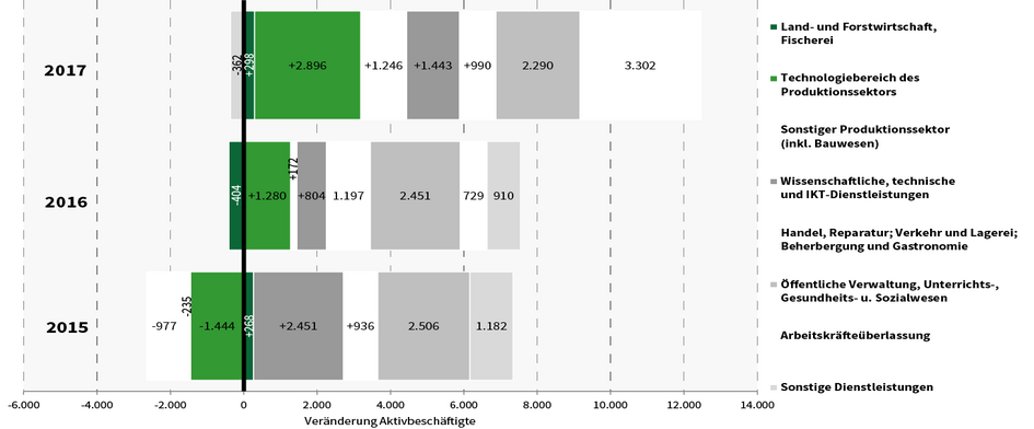 Im Dienstleistungssektor stieg die Zahl der Beschäftigten um insgesamt +7.663 Beschäftigungsverhältnisse (+2,3 %), wobei das Branchenaggregat „Handel, Reparatur; Verkehr und Lagerei; Beherbergung und Gastronomie“ ein vergleichsweise moderates Wachstum von +0,8 % (+990) aufwies.