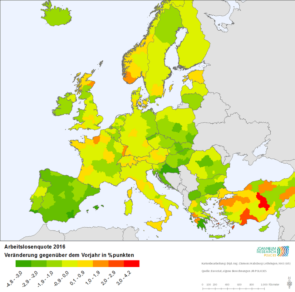 Auffallend ist zudem, dass speziell in Ländern West- und Zentraleuropas Metropolregionen weit überdurchschnittliche länderspezifische Arbeitslosenquoten aufweisen (Wien, Berlin, Paris, London) während in osteuropäischen Ländern vor allem ländliche Gebiete von höherer Arbeitslosigkeit betroffen sind: Zentralregionen wie Bukarest, Bratislava und Budapest liegen hier deutlich unter dem Landesdurchschnitt.