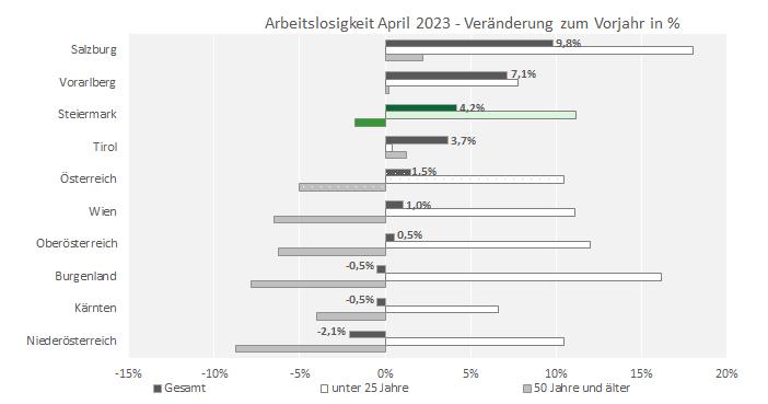 Im April 2023 waren österreichweit 258.652 Personen als arbeitslos vorgemerkt, zählt man noch die Personen in Schulung hinzu waren insgesamt 331.156 Personen betroffen. Damit wird österreichweit im April 2023 erstmalig wieder ein Anstieg der Arbeitslosigkeit (Arbeitslose: +1,5 %, Personen in Schulung: -0,1 %) beobachtet, ein Trend der sich in der Steiermark schon seit Februar 2023 abzeichnet. Insgesamt waren in der Steiermark im April 2023 29.078 Personen arbeitslos, hinzu kommen 7.830 Personen in Schulung. War die Zahl der Arbeitslosen im Vergleich mit dem Vormonat März 2023 rückläufig (-5,9 %), nahm sie im Vorjahresvergleich in der Steiermark um +4,2 % zu (Schulungsteilnehmer: -1,2 %). Im Bundesländervergleich weist die Steiermark im Vorjahresvergleich damit den drittstärksten Anstieg an Arbeitslosen, nach Salzburg (+9,8 %) und Vorarlberg (+7,1 %), auf, Rückgänge verzeichneten hingegen Niederösterreich (-2,1 %) sowie Kärnten und Burgenland (jeweils -0,5 %). Die Anzahl an offenen Stellen verringerte sich in der Steiermark im April 2023 auf 16.106 (Steiermark: -14,7 %, Österreich: -10,6 %).