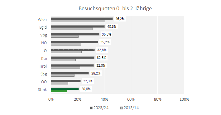 Bezogen auf die gleichaltrige Wohnbevölkerung (Stand 1.9.2023), weist die Steiermark sowohl bei den 0- bis 2-Jährigen als auch bei den 3- bis 5-Jährigen im Bundeslandvergleich die niedrigste Besuchsquote auf. Im Kindergartenjahr 2023/2024 besuchte lediglich jedes fünfte Kind im Alter zwischen 0 und 2 Jahren in der Steiermark eine institutionelle Kinderbetreuungseinrichtung. Damit bleibt die Steiermark weit hinter dem Österreichschnitt von 32,8 % zurück. Insbesondere Wien sticht mit einer Besuchsquote von 46,2 % im Bundesländervergleich hervor, überdurchschnittlich hohe Quoten werden aber auch im Burgenland (40,3 %), in Vorarlberg (36,3 %) und in Niederösterreich (35,2 %) erzielt. Verglichen mit dem Jahr 2013/14 nahm die Besuchsquote der Kleinsten zwar auch in der Steiermark deutlich zu (+8,9 %-Punkte), insbesondere Vorarlberg (+15,8 %-Punkte) und Kärnten (+14,1 %-Punkte) entwickelten sich jedoch deutlich dynamischer. Differenziert man innerhalb der Altersgruppe, zeigt sich, dass 2-jährige Kinder mit einer Besuchsquote von 40,0 % in der Steiermark rund eine doppelt so hohe Besuchsquote aufweisen wie 1-jährige Kinder (19,4 %). In Wien hingegen besucht mehr als jedes zweite Kind im Alter von einem Jahr (54,1 %) und mehr als zwei Drittel der zweijährigen Kinder (71,5 %) eine institutionelle Kinderbetreuungseinrichtung.