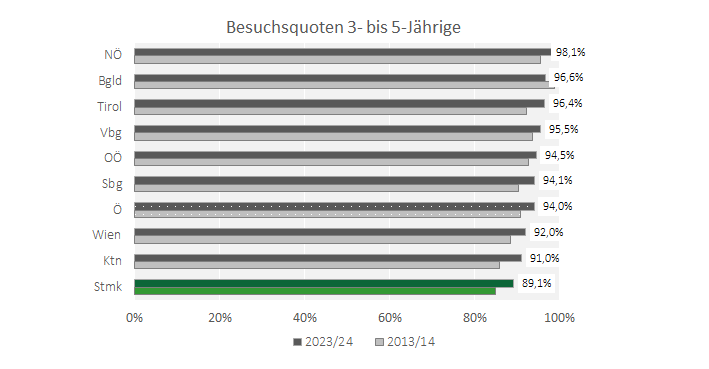 Auch in der Altersgruppe der 3- bis 5-jährigen Kinder weist die Steiermark mit einer Besuchsquote von 89,1 % den niedrigsten Anteil auf und liegt im Bundesländervergleich nach Wien (92,0 %) und Kärnten (91,0 %) am letzten Platz, wenngleich sich die Besuchsquote im Zeitraum 2023/2013 mit einem Plus von 4,3 %-Punkten überdurchschnittlich entwickelte (Österreich: +3,2 %-Punkte).
